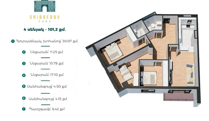 Գրիբոեդով Պարկ, նորակառույց շենքի 14/15 հարկ, 101 քմ, անկյունային բնակարան, վիտրաժ պատուհաններ (միայն այս հարկում է), բաց պատշգամբ