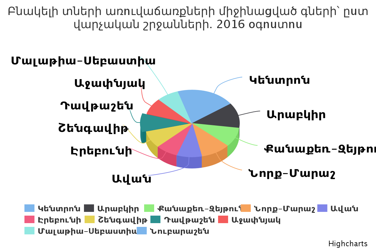Վերլուծելով պայմանագրային տվյալները՝ արձանագրվել է՝ օգոստոս ամսին բազմաբնակարան բնակելի շենքերի բնակարանների առուվաճառքների շուկայի միջինացված գինը 1քմ մակերեսի հաշվարկով ամենաթանկը եղել է Կենտրոն վարչական շրջանում՝ 476350 հզ. դրամ գնային սանդղակով, իսկ «ամենամատչելի» վարչական շրջանը Նուբարաշենն է` 1 քմ-ի համար 150800 դրամով:
