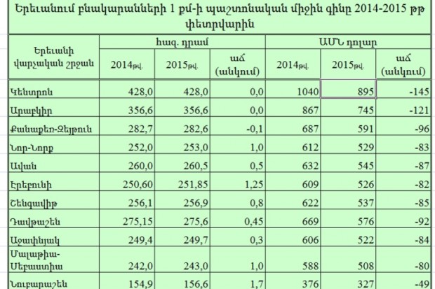 Դրամն ԱՄՆ դոլարով փոխարինելու դեպքում պատկերն այլ է: Երեւանի վարչական բոլոր շրջաններում, առանց բացառության, գները նվազել են: Բնականաբար, այդ անկումը զուտ մեխանիկական բնույթ է կրում՝ Հայաստանում ԱՄՆ դոլարի ամրապնդման հաշվին: Այստեղից կարելի է եզրակացնել, որ գների մասին պաշտոնական տեղեկատվությունը չի արտացոլում հանրապետության բնակարանային շուկայի վիճակի եւ զարգացման միտումների իրական պատկերը: