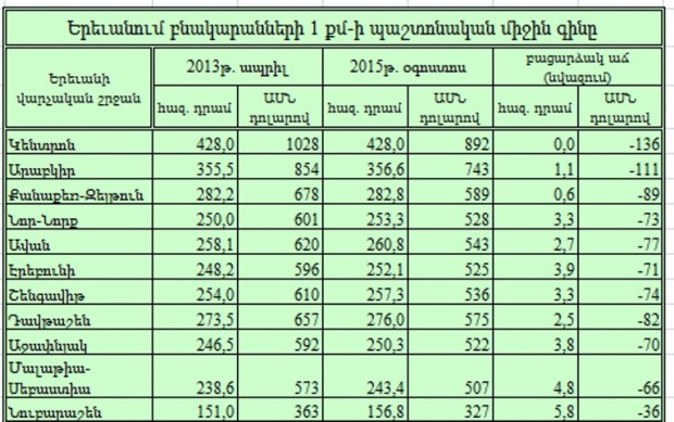 Այդ ընթացքում ԱՄՆ-ի դոլարը Հայաստանում արժեւորվել է ավելի քան 15%-ով: Դրա արդյունքում բնակարանների «քառակուսու» գինն այդ տարադրամով զգալիորեն նվազել է (տես ներքոբերյալ աղյուսակը): Գաղտնիք չէ, որ անշարժ գույքի, այդ թվում նաեւ բնակարանների առք ու վաճառքի գործարքների զգալի մասն իրականացվում է հենց դոլարով (չնայած փաստաթղթերում ձեւակերպվում է դրամով): Այդ մասին են վկայում համացանցում բնակարանների վաճառքի մասին բազմաթիվ հայտարարությունները: